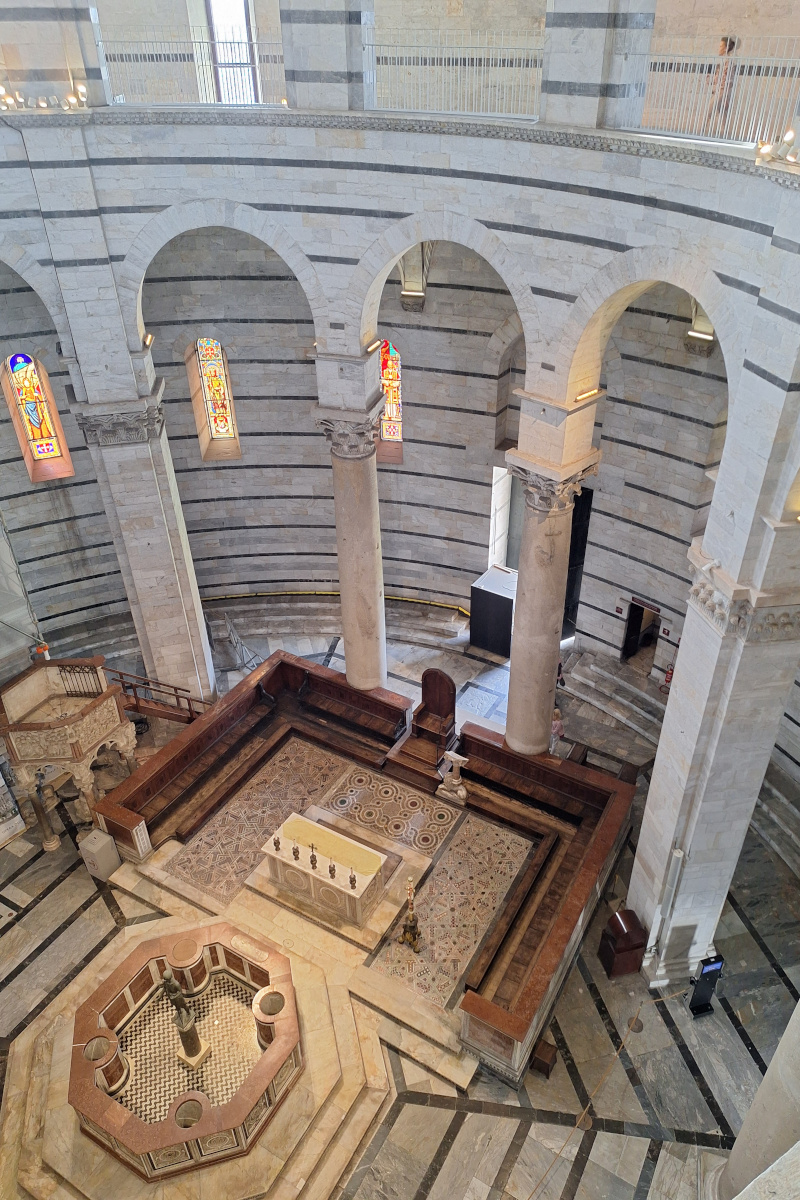 Battistero di San Giovanni: It is the largest baptistery in Italy and in the Middle Ages all children of Pisa were baptized here. The building has a circular shape with a large dome on top. Apparently it has exceptional acoustics inside and staff often demonstrate how sound echoes and resonates under the dome but we did not have a chance to hear that. If you’re traveling without a pram, you can climb the steep stairs to the first floor of the Baptistery for a unique perspective of the interior (we actually left the pram inside close to the entrance for the time of our visit).
