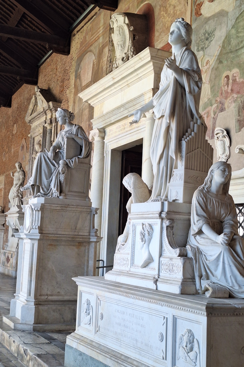 Camposanto: It’s a monumental cemetery with beautiful frescoes and a peaceful green courtyard in the center. It felt much more like an open-air art gallery than a graveyard and it was my surprise favourite. It was burial place for the elite. It was designed as a prestigious burial site for: important citizens of Pisa, noble families, clergy and intellectuals. Being buried here was a sign of status and honor. You can see there big monuments celebrated families and their achievements. The frescoes were not just decoration, they had a strong educational and moral purpose, reminding viewers of mortality and the fragility of life.