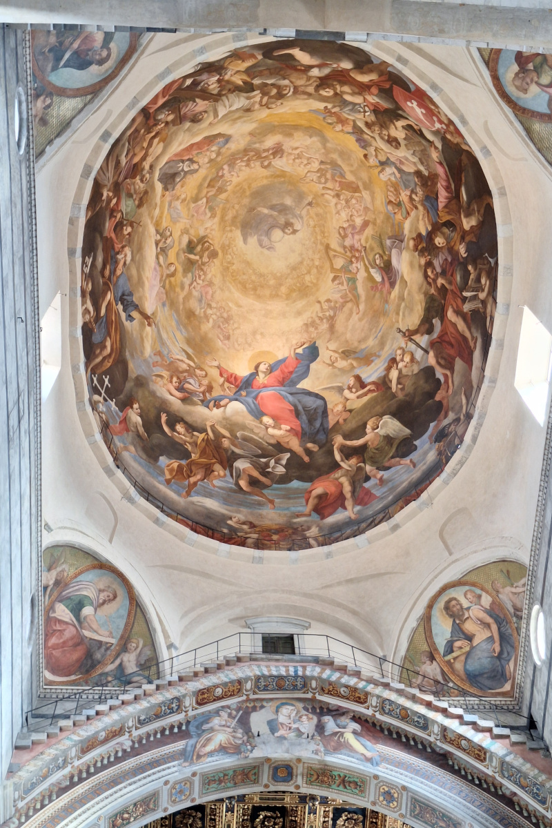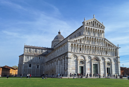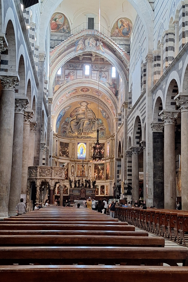 Cattedrale di Pisa Many original sculptures were created by artists but over time, they were removed to protect them from weather and damage. Today, the originals are kept in the museum, while the façade displays copies. Interior has striped marble, columns and a huge mosaic in the apse. There were many visitors inside during our visit but atmosphere was still calm and monumental. The timed tickets are used to control the number of visitors inside, so it never gets dangerously crowded.