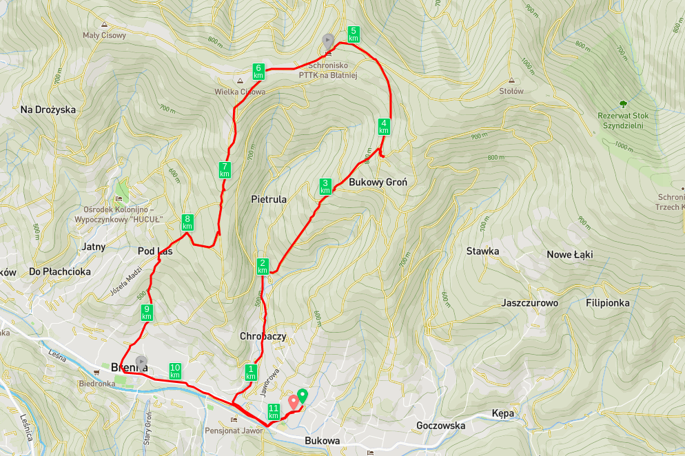 Kilka dni poźniej w Brennej spadło niewiele śniegu, ledwo pokrywając trawę w ogrodzie ale okoliczne szczyty wyglądały już na bardziej białe i dlatego od razu zdecydowaliśmy wybrać się na kolejny spacer, tym razem na Błatnią. Jako, że byliśmy na tym szczycie już kilka razy, szukałam jakiegoś alternatywnego wejścia, żeby ponownie nie iść głównym zielonym szlakiem. W aplikacji MAPS.ME zauważyłam ścieżkę zaczynającą się na końcu ulicy Chrobaczy (bardzo niedaleko domu moich rodziców), która powinna nas zaprowadzić w okolice szczytu nad schroniskiem, przechodząc przez Bukowy Groń.
