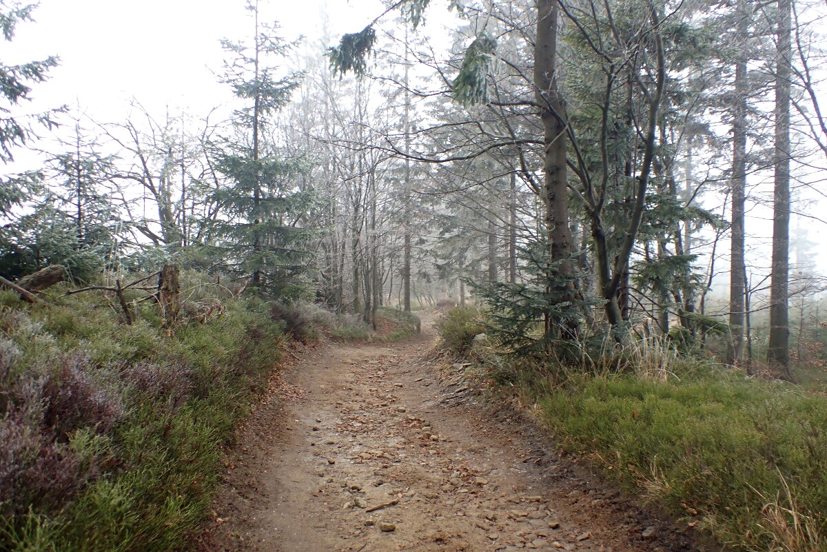 Dalej podążaliśmy cały czas tą samą ścieżką aż doszliśmy do rozwidlenia na którym skręciliśmy w lewo, podążając dalej na Halę Jaworową, przez którą prowadzi niebieski szlak (opis w kolejnym poście), zaczynający się przy zbiorniku wodnym Hołcyna. Na Hali Jaworowej wiał bardzo zimny i silny wiatr a widoczność była bardzo słaba, także szybko stamtą uciekliśmy na szczyt Kotarz a następnie odbiliśmy na czerwony szlak prowadzący na Grabową. Oszronione drzewa i krzewy oraz niewielka ilość śniegu to jedyne ślady zimy jakie tego dnia znaleźliśmy, ale i tak było warto wybrać się na ten dłuższy spacer.
